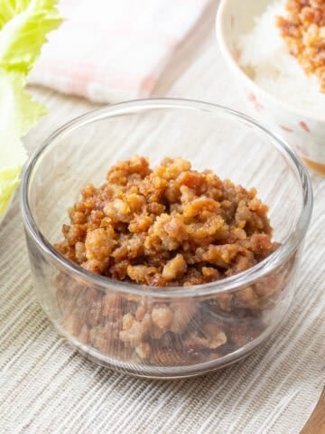 In this recipe, I used 2 tablespoons of miso and 1 tablespoon of sugar per 5.3 ounces (150 g) of ground pork. Ideally, the flavor should be slightly strong on its own. If you want an even richer taste, you can increase the amount of miso. I recommend starting with the recipe amounts first to see how you like it.